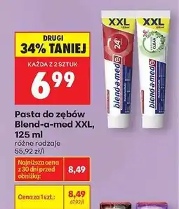 | Pasta do zębów Blend-a-med Extra XXL, 125 ml | Biedronka | 8,49 zł | 6,49 zł | 2,00 zł Rabat | 24 czerwca 2024 | 30 czerwca 2024 | |