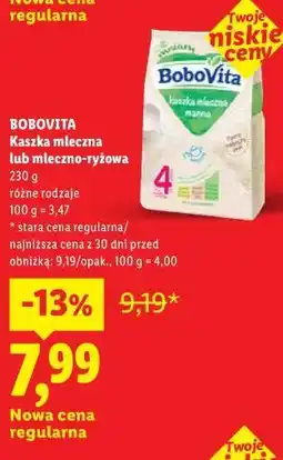 | BOBOVITA Kaszka mleczna lub mleczno - ryżowa 230 g | Lidl | 9,19 zł | 7,99 zł | 1,20 zł Rabat | 07 kwietnia 2026 | 01 maja 2026 | |