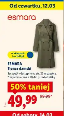 | Esmara trencz damski 1 szt | Lidl | 99,99 zł | 59,99 zł | -40% | 25 sierpnia 2025 | 31 sierpnia 2025 | |
