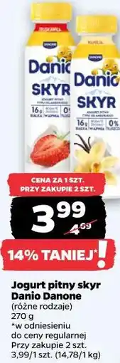 | Jogurt pitny skyr Danio Danone (różne rodzaje) 260 g | Netto | 4,69 zł | 3,99 zł | 0,70 zł Rabat | 19 stycznia 2026 | 25 stycznia 2026 | |
