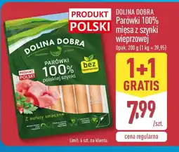 | Parówki 100% mięsa z szynki wieprzowej 1+1 GRATIS Dolina Dobra | ALDI | 3,99 zł | 21 sierpnia 2025 | 23 sierpnia 2025 | |||