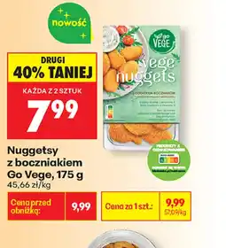 2Biedronka Go Vege Nuggetsy z boczniakiem ofertaGo Vege Nuggetsy z boczniakiem 175 gBiedronka9,99 zł7,99 złDrugi 40% taniej05 stycznia 202610 stycznia 2026 Przejrzyj ofertę
