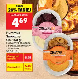 | Hummus Smaczne Go, 140 g | Biedronka | 5,45 zł | 4,49 zł | 0,96 zł Rabat | 15 lipca 2024 | 21 lipca 2024 | |