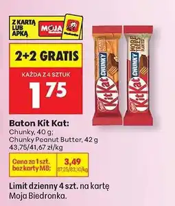 | Baton Kit Kat: Chunky, 40 g, Chunky Peanut Butter, 42 g | Biedronka | 1,75 zł | 13 listopada 2025 | 15 listopada 2025 | |||