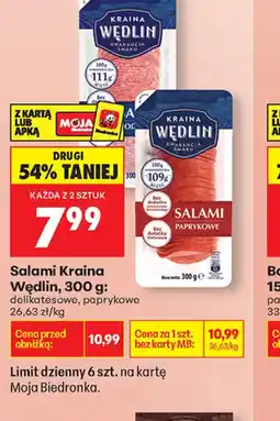 | 1 | Kraina Wędlin Salami 300 g | Biedronka | 10,99 zł | 7,99 zł | 3,00 zł Rabat | 16 lutego 2026 | 21 lutego 2026 | Przejrzyj ofertę | |