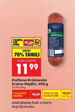 | Kiełbasa krakowska Kraina wędlin | Biedronka | 11,99 zł | 23 lipca 2024 | 29 lipca 2024 | |||