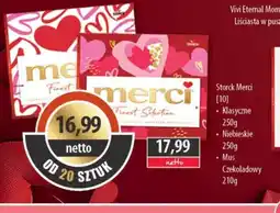 Merci to jedna z najsilniejszych marek czekoladek rozprowadzanych w Polsce. Wyrób cukierniczy został opracowany w 1965 roku w Niemczech przez firmę Storck. O tego czasu rozszerzano działalności i obecnie czekoladki można spotkać już w ponad 100 państwach świata. Produkt idealnie wpisuje się w ideę prezentu okolicznościowego. To wysokiej jakości czekolada z nadzieniem o różnym smaku, który dopasuje się do każdego gustu. O fenomenie Merci świadczy, chociażby to, że kiedy ktoś otworzy je w towarzystwie, to praktycznie każdy jest w stanie określić, które czekoladki są jego ulubionymi.