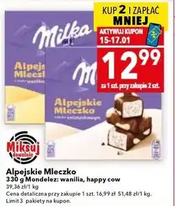 | Alpejskie Mleczko 330 g Milka: wanilia, happy cow | Lewiatan | 16,99 zł | 12,99 zł | 4,00 zł Rabat | 15 stycznia 2026 | 25 stycznia 2026 | |