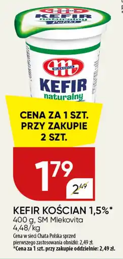 | Kefir kościan 1,5% sm mlekovita 400 g | Chata Polska | 2,49 zł | 1,79 zł | 0,70 zł Rabat | 23 kwietnia 2026 | 02 maja 2026 | |