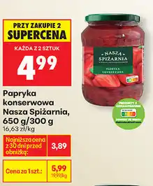 | Papryka konserwowa Nasza Spiżarnia, 650 g/300 g | Biedronka | 5,99 zł | 4,99 zł | 1,00 zł Rabat | 29 grudnia 2025 | 03 stycznia 2026 | |
