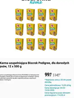 | Karma uzupełniająca Biscrok Pedigree, dla dorosłych psów 12 x 500 g | Biedronka | 114,99 zł | 99,00 zł | 15,99 zł Rabat | 04 marca 2026 | 19 kwietnia 2026 | |