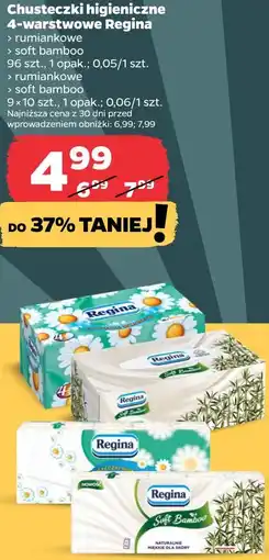 | Chusteczki higieniczne 4-warstwowe Regina (rumiankowe, soft bamboo) | Netto | 7,99 zł | 4,99 zł | 3,00 zł Rabat | 30 stycznia 2026 | 28 lutego 2026 | |