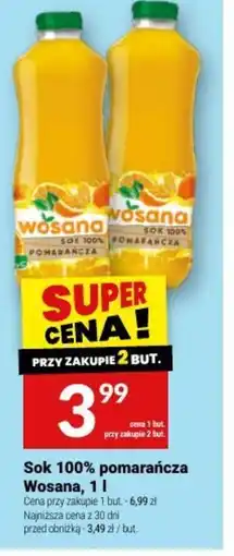 | Wosana Sok 100% pomarańcza 1 l | Twój Market | 6,99 zł | 3,99 zł | 3,00 zł Rabat | 29 grudnia 2025 | 06 stycznia 2026 | |