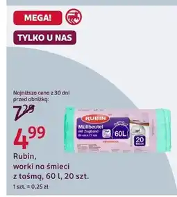 | Worki na śmieci z taśmą ściągająca 60 l Rubin Licht | Rossmann | 4,59 zł | 15 stycznia 2026 | 21 stycznia 2026 | |||