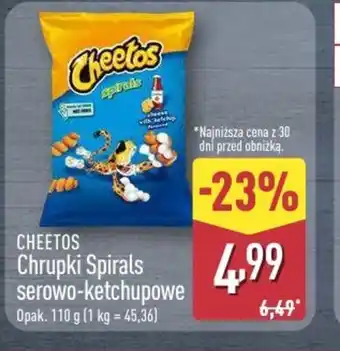 Sklep ALDI zapewnia szeroki wybór promocji. Obserwuj cotygodniowe oferty ALDI gazetka, żeby wyszukać najlepsze promocje i okazje. Oprócz ofert na Cheetos Chrupki Spirals znajdziesz także następujące promocje: Chrupki spirals ser z ketchupem Cheetos, Chrupki kukurydziane Cheetos Ketchup, Pizza, Spirals & Chrupki Cheetos.