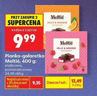 Sklep Biedronka zapewnia szeroki wybór promocji. Obserwuj cotygodniowe oferty Biedronka gazetka, żeby wyszukać najlepsze promocje i okazje. Oprócz ofert na Pianko-galaretka malinowa znajdziesz także następujące promocje: Pianko-galaretka Meltić, 400 g: malinowa, pomarańczowa, Pianko-galaretka Meltie, 400 g: malinowa, brzoskwiniowa & Galaretka.