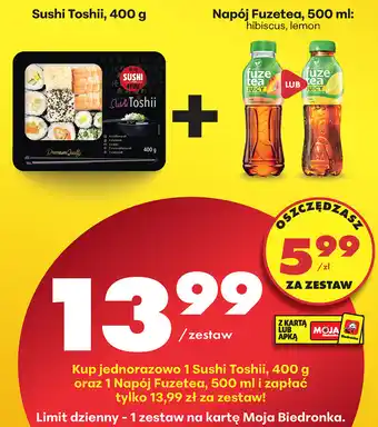 Teraz w promocji Zestaw Sushi Toshii 400 g + Napój Fuzetea 500 ml w Biedronka. Oferta ważna od 23-02 do 28-02.