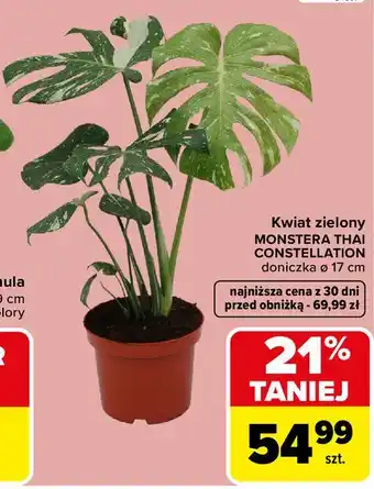 Cenę oferty na Kwiat zielony MONSTERA THAI CONSTELLATION doniczka Ø 17 cm można sprawdzić na górze strony wraz z czasem, przez który dana promocja jest dostępna. Możesz również sprawdzić cenę w aktualnej Carrefour Market gazetka lub na stronie internetowej sklepu Carrefour Market. Oferty promocyjne gwarantują zakup produktów ze sklepu Carrefour Market po najniższej cenie.
