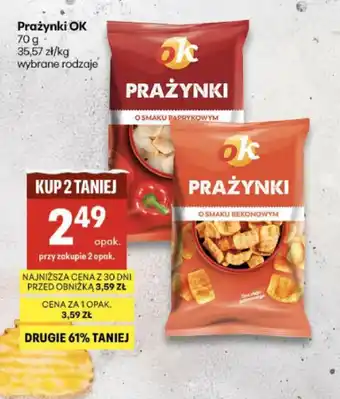 Cenę oferty na Prażynki OK można sprawdzić na górze strony wraz z czasem, przez który dana promocja jest dostępna. Możesz również sprawdzić cenę w aktualnej Delikatesy Centrum gazetka lub na stronie internetowej sklepu Delikatesy Centrum. Oferty promocyjne gwarantują zakup produktów ze sklepu Delikatesy Centrum po najniższej cenie.