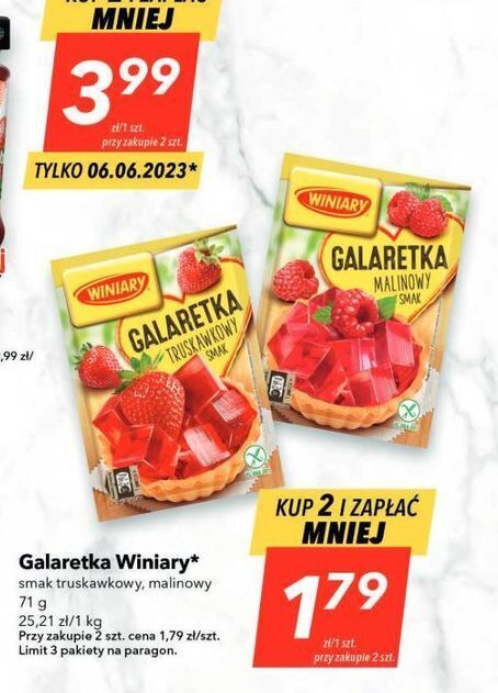 | Galaretka Winiary smak truskawkowy, malinowy, 71 g | Lewiatan | 1,79 zł | 06 czerwca 2023 | 14 czerwca 2023 | |||