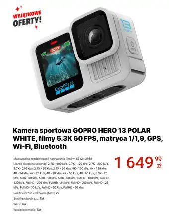 Teraz w promocji Kamera sportowa GOPRO HERO 13 POLAR WHITE, filmy 5.3K 60 FPS, matryca 1/1,9, GPS, Wi-Fi, Bluetooth w Media Expert. Oferta ważna od 26-01 do 1-03.