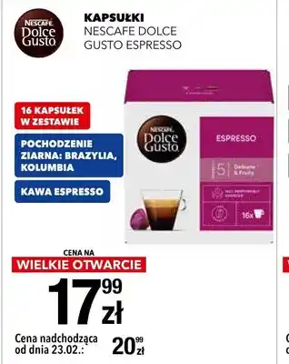Cenę oferty na Kapsułki Nescafe Dolce Gusto Espresso 14 kapsułek w zestawie można sprawdzić na górze strony wraz z czasem, przez który dana promocja jest dostępna. Możesz również sprawdzić cenę w aktualnej gazetka lub na stronie internetowej sklepu RTV EURO AGD. Oferty promocyjne gwarantują zakup produktów ze sklepu RTV EURO AGD po najniższej cenie.