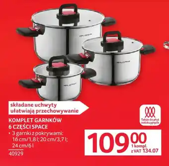 Cenę oferty na Komplet garnków Space można sprawdzić na górze strony wraz z czasem, przez który dana promocja jest dostępna. Możesz również sprawdzić cenę w aktualnej Selgros gazetka lub na stronie internetowej sklepu Selgros. Oferty promocyjne gwarantują zakup produktów ze sklepu Selgros po najniższej cenie.