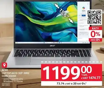 Teraz w promocji Laptop ACER AG15-32P-39R2 CORE3 N355 w Selgros. Oferta ważna od 22-04 do 6-05.